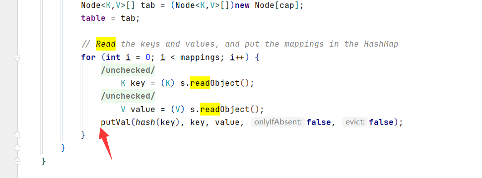 那么我们首先直奔HashMap的readObject方法,首先获取传入的key与val,后面可以看到将 HashMap 的键名计算了hash