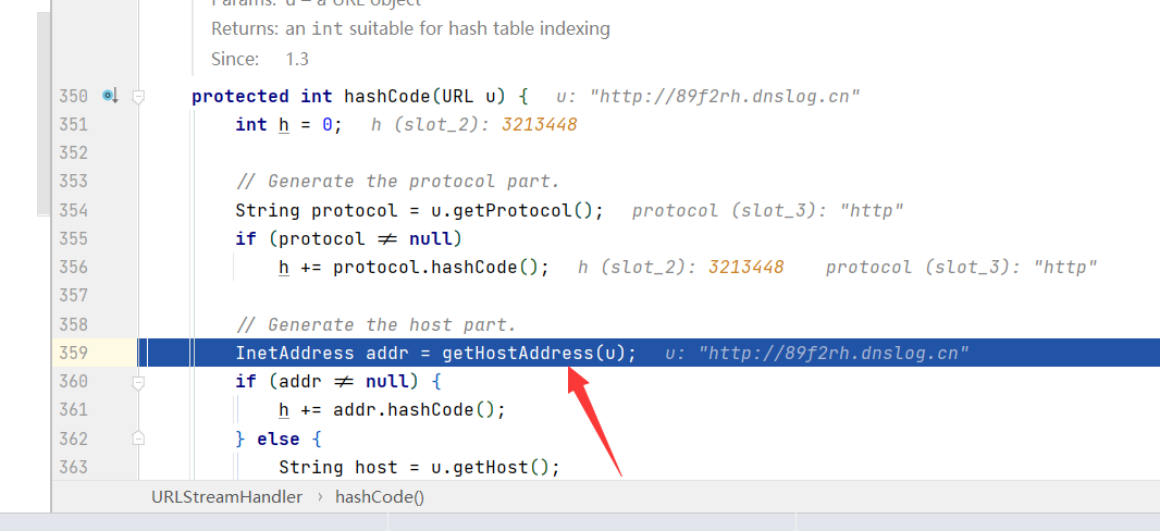 继续跟入,调用了URL类的hashcode方法,因为这个key是⼀个 java.net.URL 对象